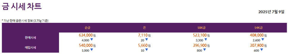 2025년 7월 9일 기준 금 시세 (3.75g = 1돈 기준)