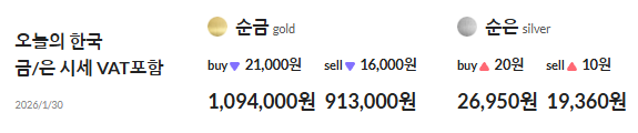 오늘의 국내 은1돈 시세 (2026년 1월 30일 기준)